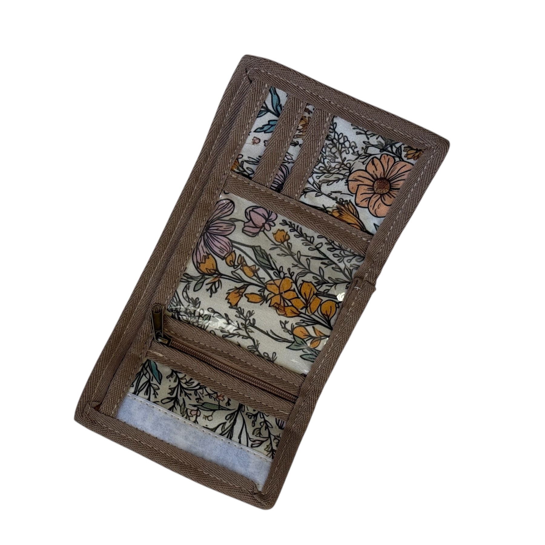 This is made of our beautiful, Nique design waterproof, easy to clean fabric, with genuine leather binding. The wallet has a zipper pocket for coins, plastic window for that special photo, 2 card slider compartments as well as a big opening for the big money.